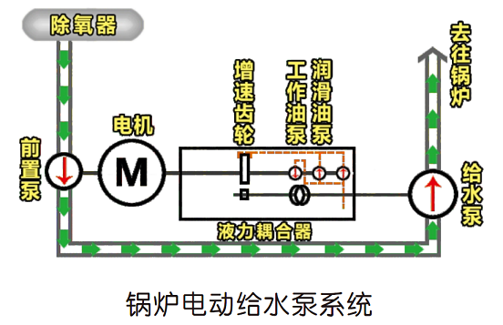鍋爐電動(dòng)給水泵系統(tǒng)由前置泵、電動(dòng)機(jī)、液力耦合器、給水泵組成。系統(tǒng)根據(jù)機(jī)組負(fù)荷變化,通過液力耦合器調(diào)節(jié)給水泵供水量的大小,以滿足鍋爐生產(chǎn)系統(tǒng)供水需求。