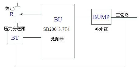 為更進(jìn)一步的節(jié)能,對換熱站實(shí)施了自動化改造,循環(huán)泵和補(bǔ)水泵用變頻調(diào)節(jié),整個城市供熱系統(tǒng)用計算機(jī)進(jìn)行監(jiān)控,實(shí)現(xiàn)了換熱站無人值守。通過循環(huán)泵使熱水在供熱系統(tǒng)中運(yùn)行,管道、閥門的泄漏引起循環(huán)水的水壓降低,如不及時補(bǔ)水,會造成供熱系統(tǒng)運(yùn)行不正常。補(bǔ)水泵的變頻泵補(bǔ)水方式比較簡單,采用恒壓供水方式,設(shè)定壓力為4kg。本例選用一臺SB200-3.7T4變頻器,選用森納斯DG130W-BZ-A 1MPa壓力變送器,變頻調(diào)速補(bǔ)水系統(tǒng)如圖所示: