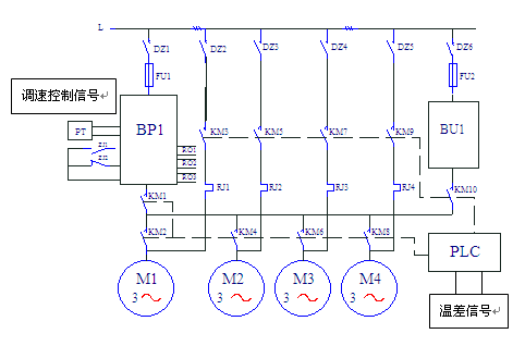圖中,BP1—森蘭SB200-37T4變頻器,BU—軟啟動器(自耦減壓起動器),系統(tǒng)采用循環(huán)投切方式,溫差信號送入PLC,經(jīng)過PLC處理后,到變頻器作為調(diào)速控制信號。整個系統(tǒng)的運(yùn)行信息由PLC送到計算機(jī)上。