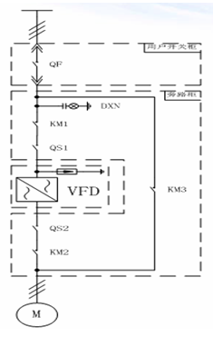 合KM3、分KM1、KM2、為工頻模式。電機可由QF直接啟停并進行保護,變頻器可完全和電網脫離。