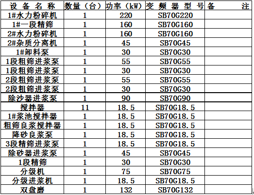 造紙生產(chǎn)線上的輔機(jī)很多,為節(jié)能基本都需要變頻調(diào)速。實(shí)踐已經(jīng)證明,造紙輔機(jī)實(shí)施變頻調(diào)速后,平均節(jié)能在12%,經(jīng)濟(jì)效益明顯。浙江富陽(yáng)某造紙廠生產(chǎn)線上的部分輔機(jī)設(shè)備如下表: