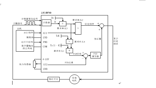 由代表生產(chǎn)紙線速度的主機(四缸或壓光機變頻器)運行頻率和卷繞紙張的實時卷徑計算出相應(yīng)的從機(卷取機)主給定頻率,以此作為前饋;同時用PID調(diào)節(jié)器控制紙張的張力PID輸出,對給定頻率進行不斷修正,將修正后的頻率作為卷取電機的給定頻率。這種前饋和反饋共用的復(fù)合控制方法控制精度很高,很多張力控制專用的變頻器都使用了這種方法。而SB70G可以通過可編程模塊來編程實現(xiàn)這種控制,使用方便,方法靈活。系統(tǒng)控制框圖如下: