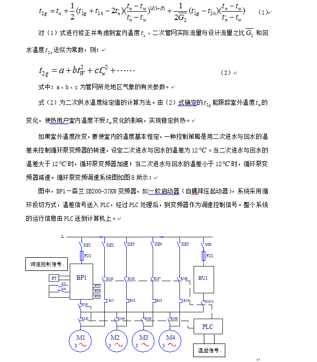 為節(jié)省能源,減少城市污染,充分利用火力發(fā)電廠蒸汽輪機(jī)發(fā)電后的余熱,在冬季對北方城市集中供熱。從發(fā)電廠送出來的熱水,到城市中的換熱站時,一次供水熱水溫度有90多度,經(jīng)過熱交換器后,一次回水熱水的溫度下降到60多度,然后再流回發(fā)電廠。送到城市居民家中的熱水,進(jìn)入換熱站熱交換器的二次回水溫度有50多度,二次供水溫度60多度。陜西寶雞有許多這樣的換熱站,其中有一換熱站有四臺熱交換器,四臺37kW的管道泵組成的循環(huán)泵組,一臺3.7kW的補(bǔ)水泵。循環(huán)泵和補(bǔ)水泵采用人工開、關(guān)閥門控制流量,使管路的阻尼增大而造成電能浪費(fèi)。