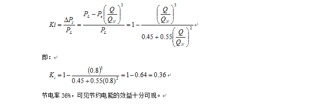 循環(huán)泵變頻調(diào)速后,所有的閥門開度最大,系統(tǒng)的阻力最小,當(dāng)平均流量是設(shè)計(jì)流量的80%時,節(jié)電率可按GB12497《三相異步電動機(jī)經(jīng)濟(jì)運(yùn)行》強(qiáng)制性國家標(biāo)準(zhǔn)實(shí)施監(jiān)督指南中的計(jì)算公式計(jì)算:
