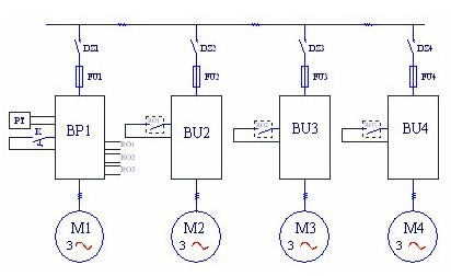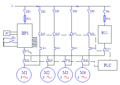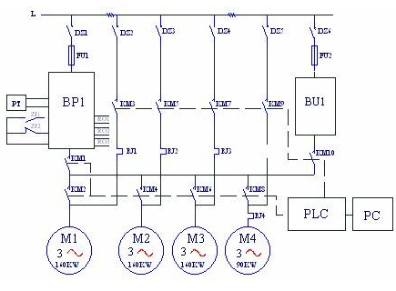 圖中:BP1—變頻器;BU2~BU4--軟起動器,PT—壓力變送器。由圖一可見,變頻器連接在第一臺水泵電機上,需要加泵或減泵時,由變頻器RO1~RO3端口輸出信號起動或停止其他的水泵,這時水泵的起動采用自耦降壓起動裝置或軟起動器。這種方案的特點是水泵電機不需要在變頻和工頻之間切換;第一臺水泵永遠連接在變頻器上,沒有切換過程中的失壓現(xiàn)象;由于變頻泵以外的泵都有軟起動器,所以不需要再做備用系統(tǒng),當變頻器故障時,可用軟起動器手動起動M2~M4水泵,保證供水不致中斷;每臺電機都有起動器,初始投資較大。另一種是“循環(huán)投切”方案,系統(tǒng)圖如圖二所示