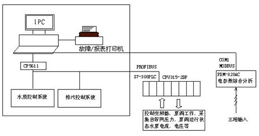 為保證系統(tǒng)的可靠性,上位機PC用于管理,用組態(tài)軟件做出若干工藝流程圖,實時顯示系統(tǒng)的運行狀況,并統(tǒng)計歷史數(shù)據(jù),如需要可隨時打印報表;還用于故障的報警和處理。PC機為研華工業(yè)計算機,PLC為西門子S-7300,便于與總控室計算機聯(lián)網(wǎng),采用帶有PROFIBUS接口的CPU315。CP5611是通信模塊,PDM-820AC電參數(shù)綜合分析儀用于檢測系統(tǒng)的用電量??刂扑玫钠?停,切換,閥的啟/閉;電機電流,溫度的檢測,水泵使用時間的統(tǒng)計;壓力,流量,水質(zhì)參數(shù)的采集等,均由PLC完成。水壓的給定值由變頻器鍵盤設定。