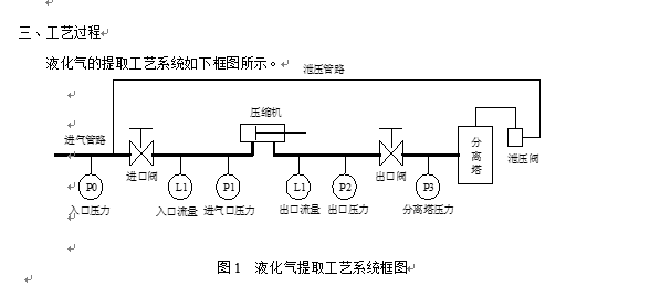 煉油產(chǎn)生的氣體,經(jīng)過(guò)壓縮機(jī)加壓后凝為液態(tài)進(jìn)入分離塔,經(jīng)過(guò)吸收等其他加工工藝,提取出石油液化氣。進(jìn)氣口壓力P1要求小于0.6MPa,壓縮機(jī)出口壓力P2可達(dá)到1.2MPa~1.7MPa之間,經(jīng)出口閥調(diào)節(jié)后保證分離塔壓力P3在1.05MPa。如果某種原因使分離塔壓力升高,為安全起見(jiàn)則泄壓閥打開(kāi),將分離塔內(nèi)液體經(jīng)管道回流進(jìn)氣口。