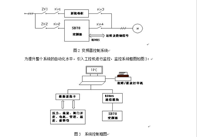 模擬量數(shù)據(jù)采集卡將壓力、流量、閥門(mén)開(kāi)度、電機(jī)溫度和管道溫度等模擬信號(hào)轉(zhuǎn)換成12位的數(shù)字信號(hào),每一路信號(hào)占用數(shù)據(jù)采集卡上一個(gè)模擬通道,互不影響,采樣周期為300ms。SB70變頻器支持RS485半雙工串行通訊方式,通過(guò)在工控機(jī)上用IP函數(shù)或VB的MSCDMM通訊控件編制串行通訊程序,即可實(shí)現(xiàn)工控機(jī)與變頻器之間的通訊,本系統(tǒng)用VB的通訊控件編制。將采集到的數(shù)據(jù)信號(hào),經(jīng)實(shí)時(shí)分析處理后,通過(guò)組態(tài)王監(jiān)控畫(huà)面,監(jiān)測(cè)現(xiàn)場(chǎng)傳輸?shù)膶?shí)時(shí)數(shù)據(jù)和歷史數(shù)據(jù)及設(shè)備的運(yùn)行狀況、歷史曲線的分析、實(shí)時(shí)報(bào)表、歷史報(bào)表的打印、聲光報(bào)警等。
