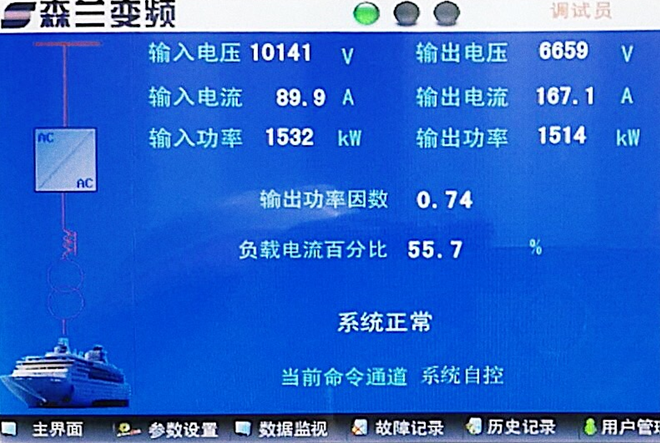 2017年3月7日上午,隨著一艘巨輪EVERLISSOME LONOON號(hào)慢慢駛?cè)霃B門港遠(yuǎn)海碼頭,由希望森蘭科技股份有限公司與上海艾臨科智能科技有限公司共同研制的新一代VFPS系列戶外集裝箱式智能岸電電源系統(tǒng)正式服役之旅。隨后EVER LISSOME LONNON號(hào)船上工作人員開始放船用連接高壓電纜,岸上工作人員將高壓電纜連接到港口#14泊位區(qū)岸電接線箱,EVER LISSOME LONNON具有連接岸電條件。經(jīng)過檢查船上連接安全回路,一切準(zhǔn)備就緒。隨著連船總指揮一聲指令,希望森蘭VFPS系列岸電電源系統(tǒng)進(jìn)入一鍵啟動(dòng)程序。上午11點(diǎn)19分5秒,VFPS系列岸電電源系列正式進(jìn)入并網(wǎng)程序,并網(wǎng)過程無沖擊,負(fù)荷從船上發(fā)電機(jī)系統(tǒng)慢慢向岸上電源系統(tǒng)轉(zhuǎn)移,并于10S后船上發(fā)電機(jī)系統(tǒng)順利解列,正式由VFPS系列岸電電源供電。經(jīng)過11個(gè)小時(shí)連續(xù)運(yùn)行,晚上22:5分再次完成發(fā)電機(jī)并網(wǎng),并將岸上電源順利解列,至此,與EVER LISSOME LONNON號(hào)連船順利結(jié)束,連船宣告成功。本次連船岸上供電14823度電,岸上電源最大輸出功率為1658KW,輸出電壓穩(wěn)定度0.3%,輸出頻率穩(wěn)定度0.1%。