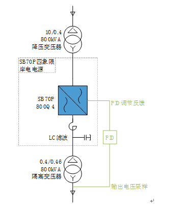 岸電系統(tǒng)在輸出隔離變壓器后端設(shè)置了輸出電壓采樣點(diǎn),該點(diǎn)采樣得到實(shí)時(shí)輸出電壓值后將數(shù)據(jù)送往系統(tǒng)內(nèi)部PID機(jī)構(gòu)進(jìn)行對(duì)比,將結(jié)果轉(zhuǎn)換為控制指令后送往岸電系統(tǒng)。岸電系統(tǒng)對(duì)輸出電壓進(jìn)行調(diào)節(jié),最終輸出電壓達(dá)到預(yù)期輸出值,岸船連接段系統(tǒng)壓降問題被解決。