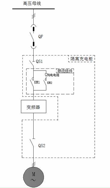考慮到用戶現(xiàn)場電網(wǎng)容量有限、電機(jī)功率較大。為了避免在送電瞬間的沖擊電流,故在主回路中增加充電電阻。用來減小沖擊電流及控制母線電壓降。主回路采用真空接觸器并實(shí)現(xiàn)在完成充電后自動投切。采用現(xiàn)場控制箱和DCS系統(tǒng)對高壓變頻器進(jìn)行控制、監(jiān)測。